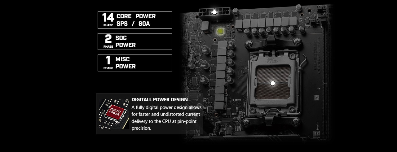 Dezlantuiti si sustineti performanta maxima cu un design VRM agresiv construit cu un sistem de alimentare digitala a procesorului. Combinand conectorii de alimentare cu 8 + 8 pini si tehnologia exclusiva Core Boost, placa de baza din seria MAG este pregatita sa sustina sarcini grele de gaming.