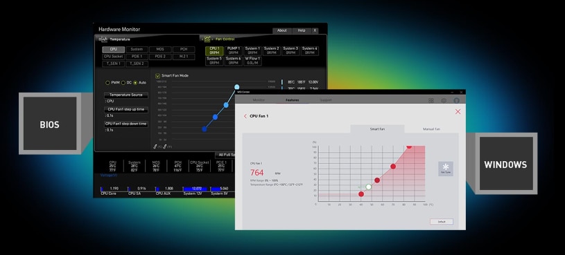 Placile de baza MSI va permit sa gestionati vitezele si temperaturile pentru toate ventilatoarele sistemului si ventilatoarele CPU in BIOS si software cu o interfata grafica simplificata. De asemenea, puteti seta pana la pana la 4 obiective de temperatura, care vor ajusta automat vitezele ventilatoarelor.