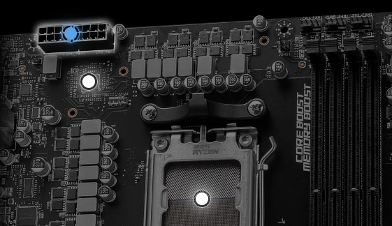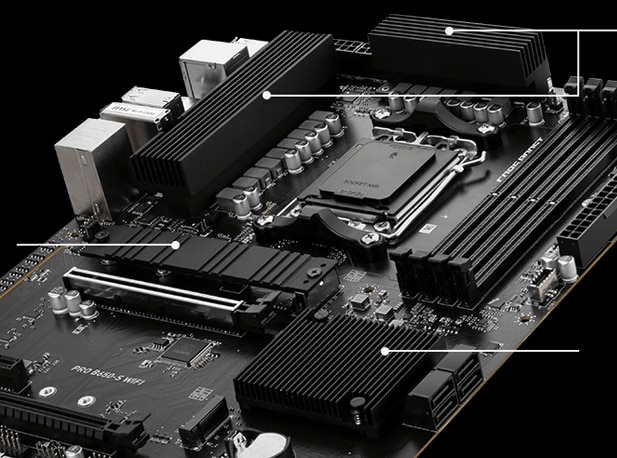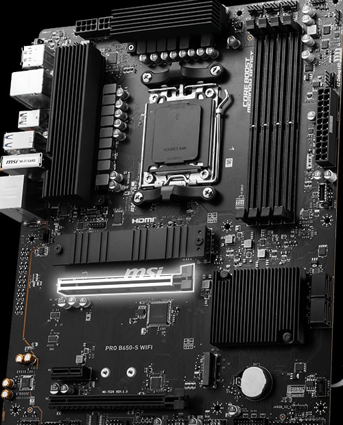 Dezlantuiti si sustineti performanta maxima cu un design VRM emblematic construit cu un design total de alimentare 12+2+1. Combinand conectori dubli de alimentare si tehnologia exclusiva Core Boost, PRO B650-S WIFI este pregatit pentru provocarea procesoarelor high-end.