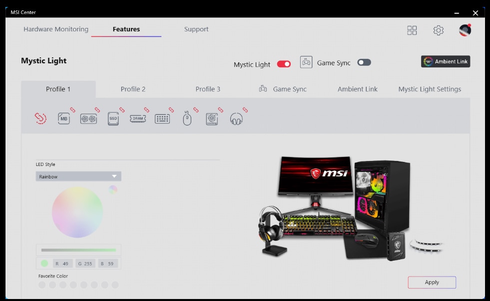 MYSTIC LIGHT "Stropeste" culori si efecte de iluminare RGB vibrante folosind MSI Mystic Light cu 16,8 milioane de culori si efecte LED fanteziste. MSI Mystic Light va ofera un control complet al iluminarii RGB a PC-ului dvs. intr-un singur software. | ![]() |