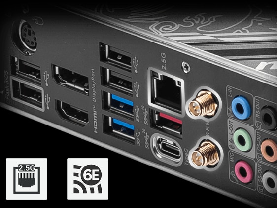 | Conectori | Total Porturi | 1 x PS/2 1 x RJ-45 6 x Audio Jacks 1 x DisplayPort 1 x HDMI 2 x Antenna Ports 1 x USB 3.2 Gen 2x2 20Gbps (Type-C) 1 x USB 3.2 Gen 2 Tip-A 2 x USB 3.2 Gen 1 5Gbps Type-A 4 x USB 2.0 |