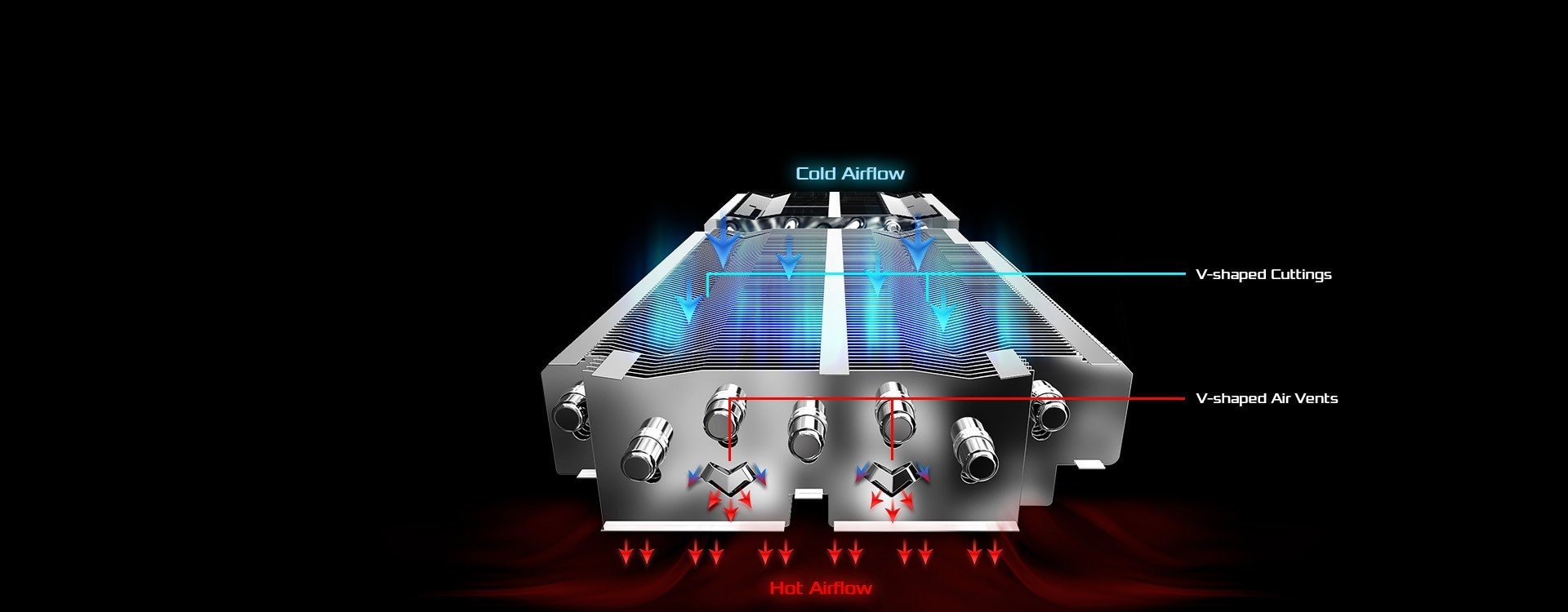 Ghidati fluxul de aer sa treaca mai regulat si mai rapid pentru a spori eficienta racirii prin aripioarele de taiere in forma de V si orificiile de aerisire in forma de V.