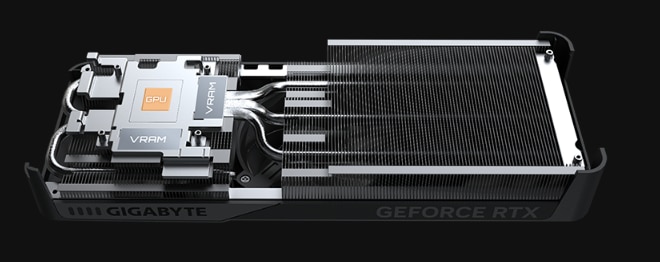 CAMERA DE VAPORI MARE SI TEVI DE CALDURA DIN CUPRU COMPOZIT Camera de vapori mare intra in contact direct cu GPU-ul, impreuna cu conductele termice din cupru compozit, care transfera rapid caldura GPU-ului si a VRAM-ului catre radiator. |