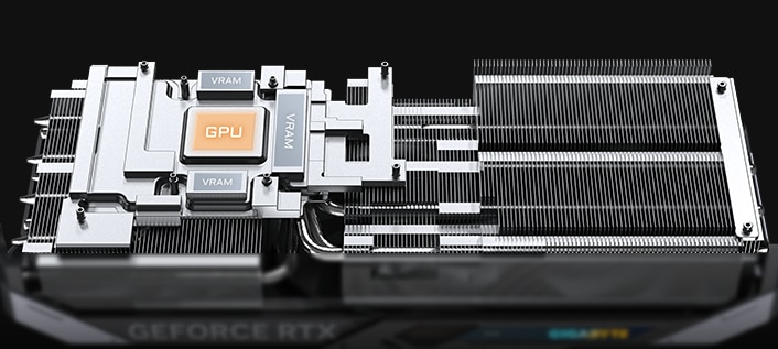 CAMERA DE VAPORI MARE SI TEVI DE CALDURA DIN CUPRU COMPOZIT Camera de vapori mare intra in contact direct cu GPU-ul, impreuna cu conductele termice din cupru compozit, care transfera rapid caldura GPU-ului si a VRAM-ului catre radiator. |
