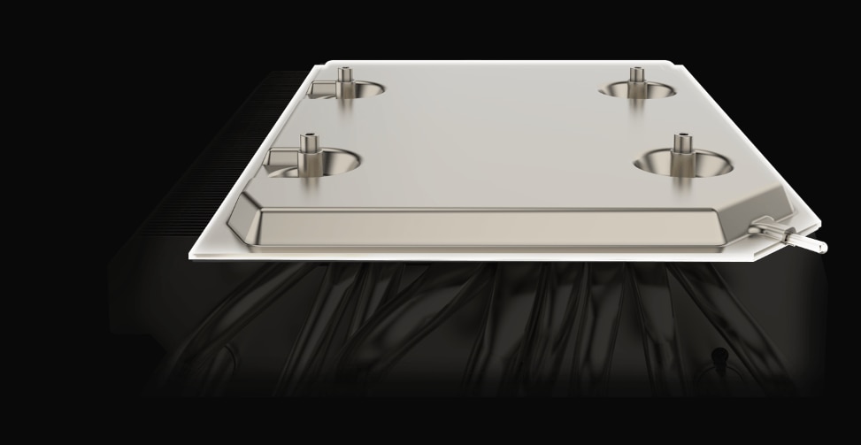 O placa anti-flexiune turnata sub presiune intareste intreaga placa, in timp ce placutele termice permit racirii sa ajunga la componentele critice de dedesubt.