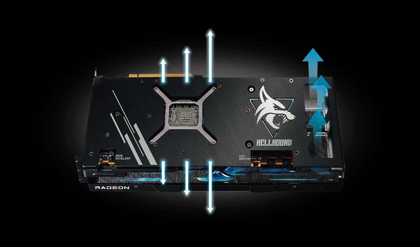 PowerColor Hellhound RX 7900 XT adopta o solutie de ventilatoare cu trei inele (100 x 90 x 100mm), un set de 8 heatpipes de 6φ care traverseaza radiatorul si o placa de cupru care atinge direct GPU-ul, acoperind in acelasi timp VRAM-ul, pentru a obtine o mai buna eficienta de racire. In plus, produsul este construit cu un design VRM cu 10+3+1+2+1 faze si DrMOS care vine cu monitorizare digitala in timp real IMON, cu scopul de a oferi o iesire de performanta fiabila in timpul jocurilor.