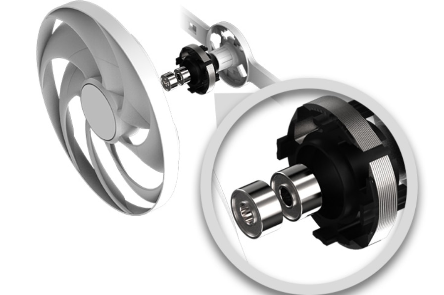Rulment cu doua bile Acestea dispun de ventilatoare cu rulmenti cu doua bile, care au o durata de viata cu aproximativ 85% mai mare decat rulmentii cu manson in testele noastre. Imbunatatirile aduse paletelor ventilatorului inseamna ca solutia este cu pana la 10% mai silentioasa decat generatia anterioara. |