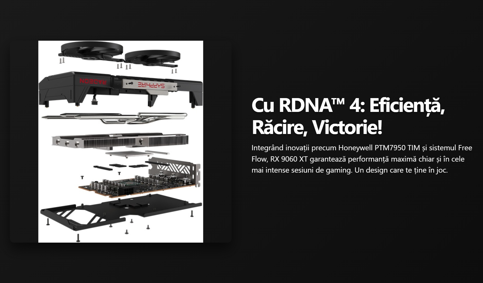 | Tehnologii AMD/nVidia | Tehnologii | AMD RDNA™ 4 Architecture DirectX® 12 Ultimate Hardware Raytracing 4nm GPU GDDR6 Memory PCI® Express 4.0 Support AMD FreeSync™ Technology DisplayPort™ 1.4 with DSC HDMI™ 2.1 VRR Video Streaming up to 8K Radeon™ VR Ready Premium AMD FidelityFX Radeon™ Image Sharpening Radeon™ Anti-Lag Radeon™ Software Game Driver Optimizations |