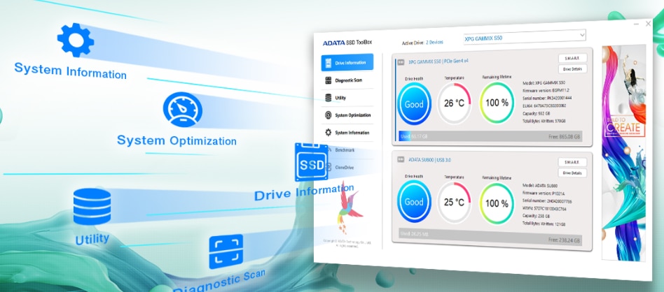 SSD ToolBox SSD ToolBox va asigura automat ca aveti cel mai recent firmware pentru o performanta optima si permite monitorizarea starii de sanatate a unitatii si a duratei de viata ramase prin atributele tehnologiei de autocontrol, analiza si raportare (S.M.A.R.T.). De asemenea, va permite sa urmariti temperatura de functionare curenta, capacitatea si spatiul total utilizat. |