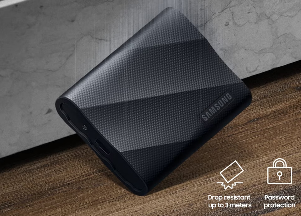 Protejati-va datele cu incredere Bucurati-va de liniste sufleteasca cu T9. Conceput pentru a proteja datele impotriva socurilor externe cu rezistenta la cadere de pana la 3 metri, va puteti relaxa si proteja bunurile valoroase. Unitatea poate fi, de asemenea, securizata cu o parola criptata AES pe 256 de biti.