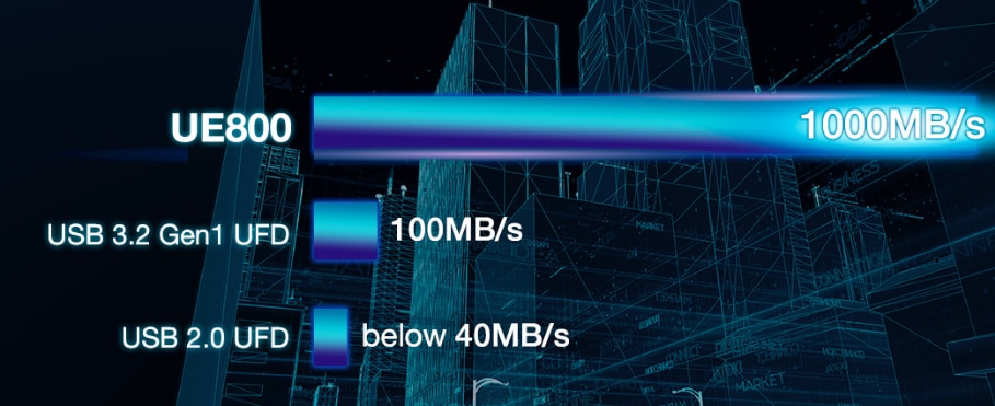 Nivel de viteza in sus Unitatea compacta UE800 ofera viteze de citire/scriere de pana la 1.000 MB/s, de 10 ori mai rapide decat o unitate USB 3.2 Gen1 medie. |