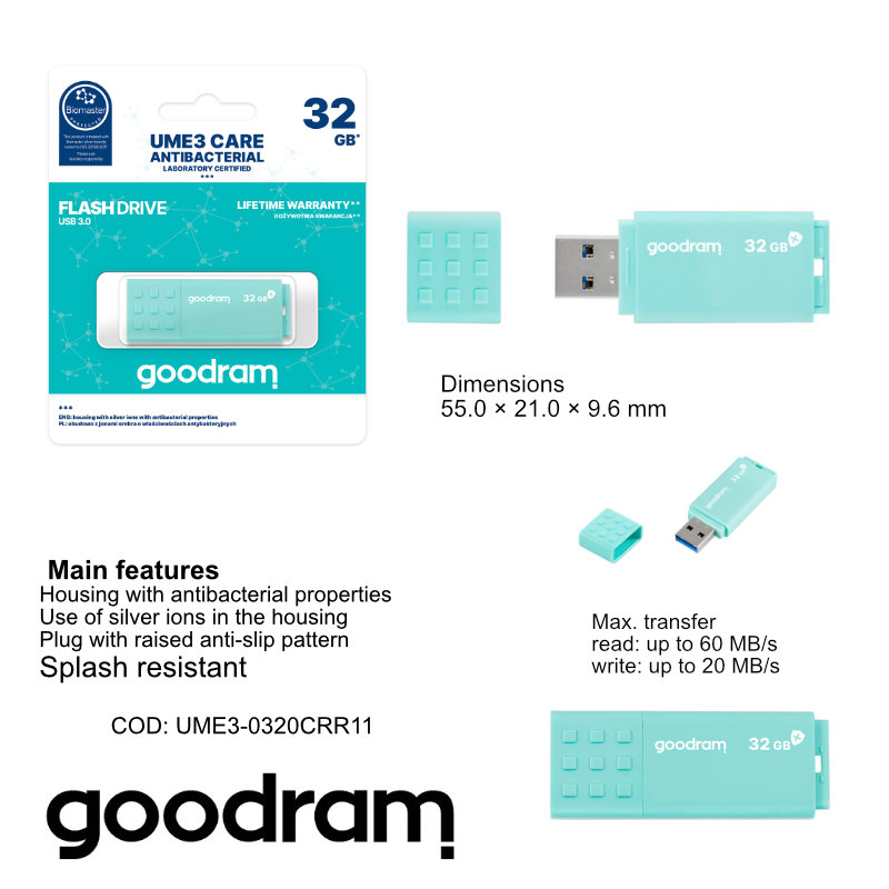 Modelul UME3 CARE este prima unitate flash a marcii GOODRAM cu carcasa antibacteriana.