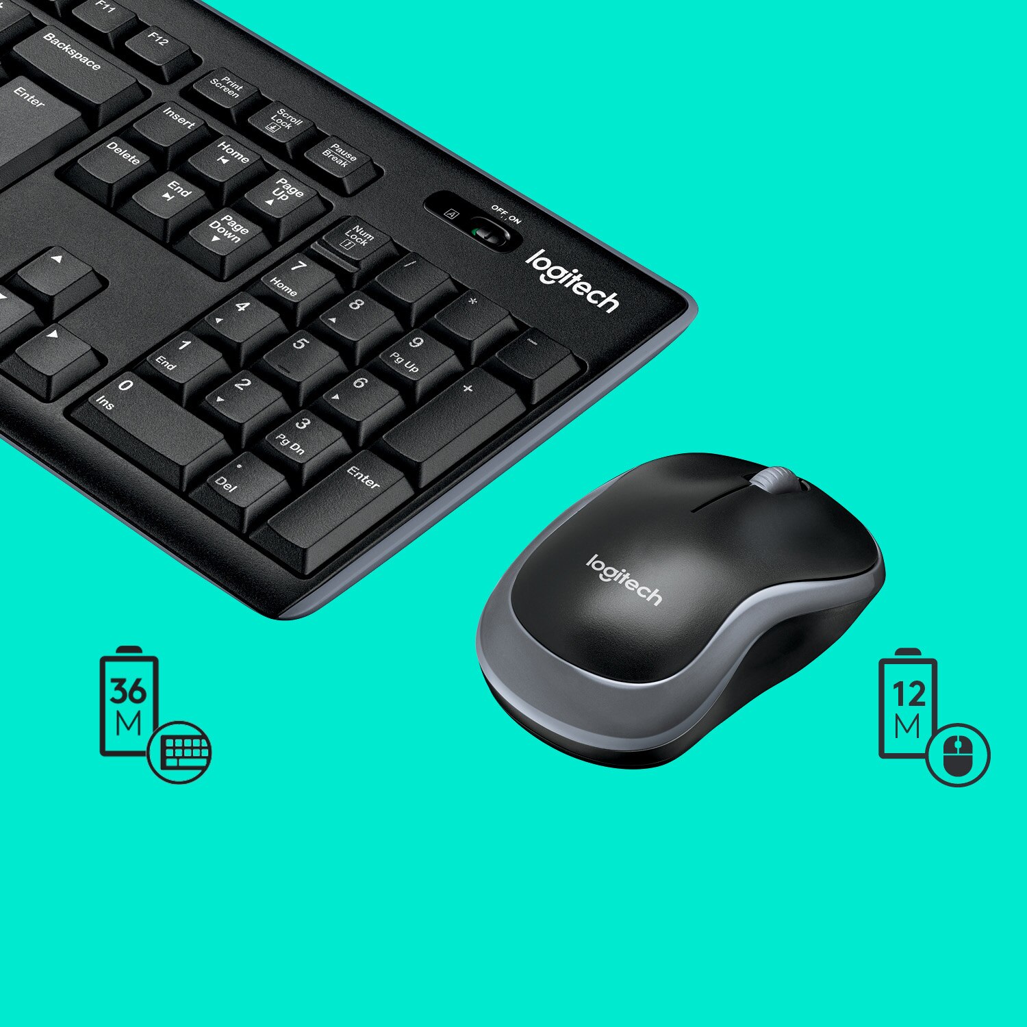 Tastatura ramane incarcata pentru 36 de luni, iar mouse-ul timp de 12 luni, iar functiile de auto-sleep si butonul on/off te asigura ca nu vei ramane fara baterie atunci cand ai cea mai mare nevoie**. **Durata de viata a bateriei din tastatura este calculata pe baza unui estimate de doua milioane de apasari de taste pe an intr-un mediu de lucru controlat. Experienta fiecarui utilizator poate varia. Durata de viata a bateriei mouse-ului variaza in functie de frecventa si durata utilizarii. |