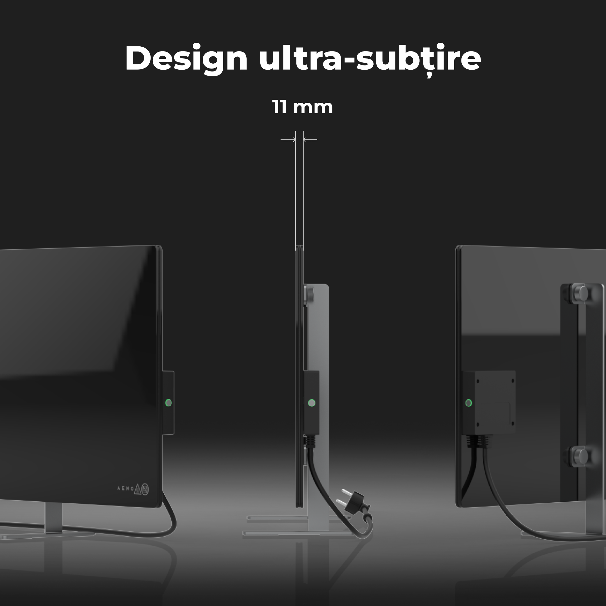 Incalzitorul AENO este fabricat din materiale de calitate superioara. Cu adevarat un incalzitor cu design premium. Design minimalist implementat in sasiul de 11 mm din sticla rezistenta cu picioare din aluminiu. Este perfect din orice unghi.