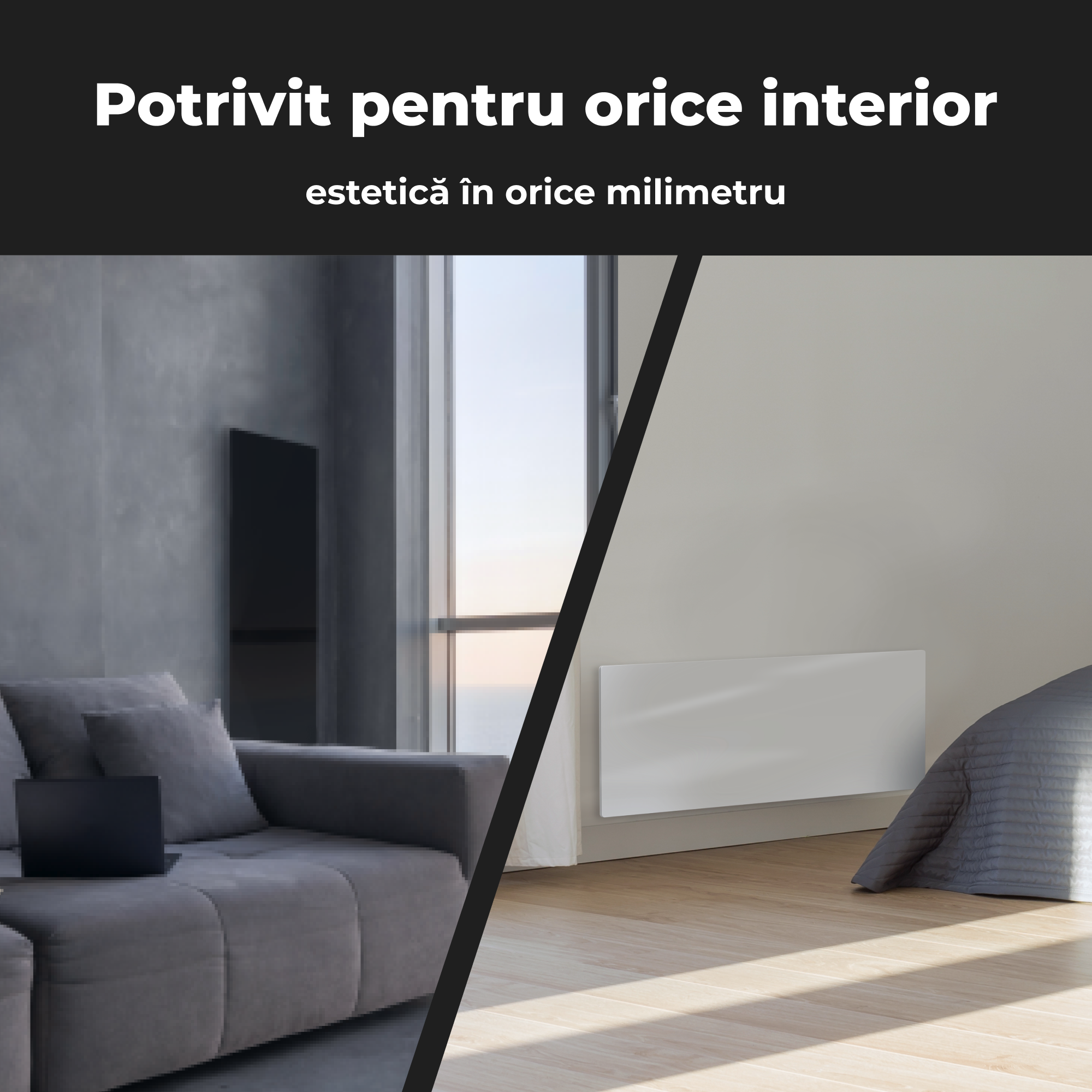 Incalzitor cu design premium si estetica in fiecare detaliu se potriveste perfect in orice stil de interior. Alege modelul alb sau negru care se potriveste cel mai bine cu interiorul tau pentru un design cu adevarat invizibil.