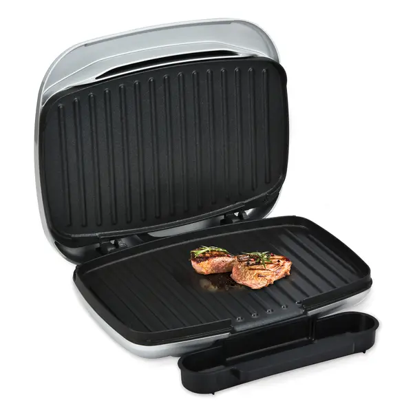 Gratar electric Heinner AriaGrill HEG-F1000SL, 1000W; placi fixe turnate 27 X 23 cm, invelis antiaderent, maner rece, Indicator luminos, tava pentru colectare ulei, Argintiu