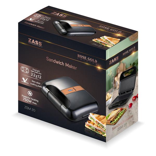 Sandwich-Maker Zass Rose Gold ZSM 20, 750 W, Control electronic al temperaturii, Indicator LED, Maner termo-rezistent, Picioruse anti-alunecare (Negru/Roz)