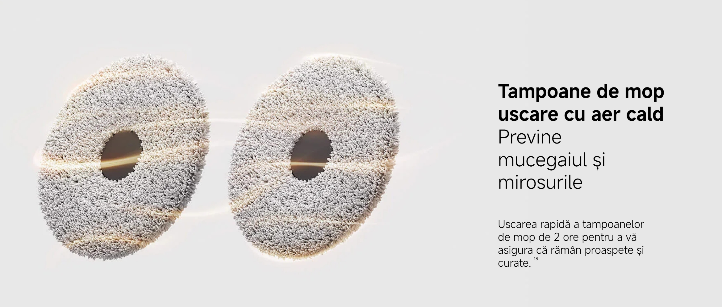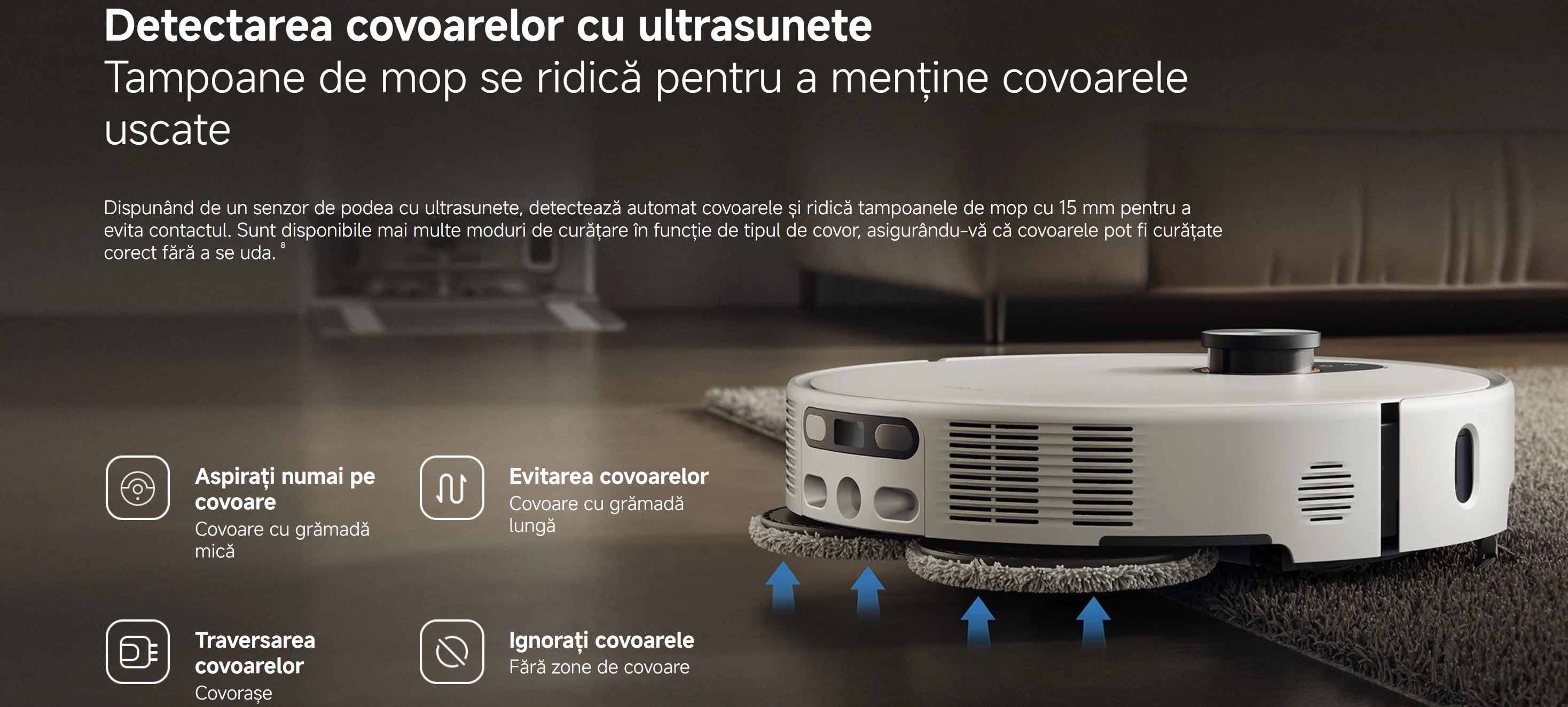 Când sunt detectate deșeuri solide, tampoanele de mop se ridică și trec în modul de aspirare.