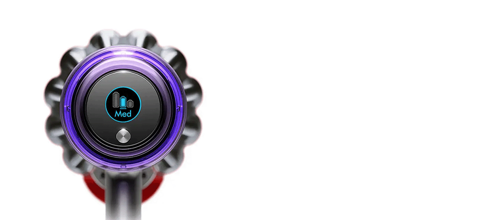 Aspiratorul vertical fara fir Dyson V11 Advanced monitorizeaza performanta de aspirare si raporteaza datele in timp real pe ecranul LCD.