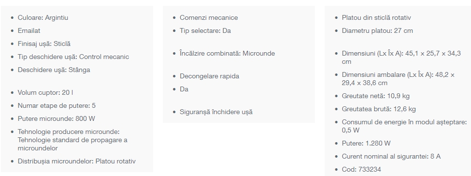 Un cuptor cu microunde fix cum îmi doream, de dimensiuni reduse, care încălzește foarte bine și rapid orice preparat. Îmi plac deschiderea ușii cu buton și funcția de autocurățare auquaclean.
