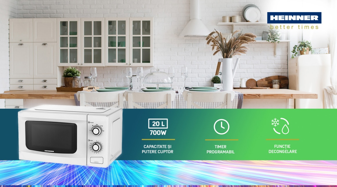 Descrierea produsului Cuptor cu microunde Heinner HMW-M2035WH, 20 l, 700 W, Control mecanic, Timer, Alb