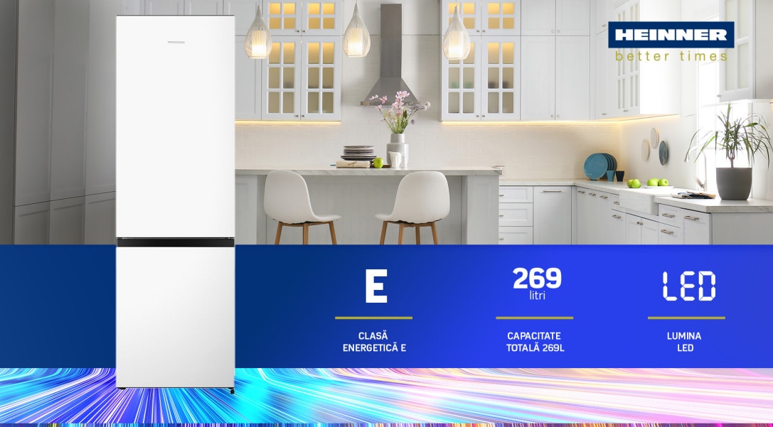 Descrierea produsului Combina frigorifica Heinner HC-HM269E++, 269 l, Clasa E, Control mecanic, Iluminare LED, H 180 cm, Alb