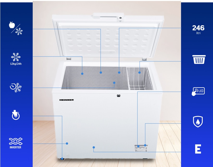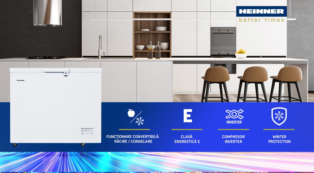 Descrierea produsului Lada frigorifica Heinner HCF-246CNHE++, 246 L, Clasa E, Compresor inverter, Control electronic, Iluminare LED, Functionalitate frigider (Alb)