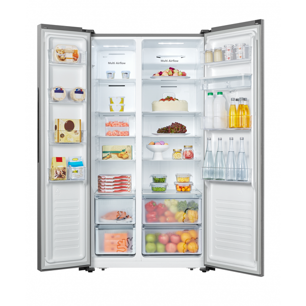 Side by side Heinner HSBS-520NFXWDF+, Full No Frost, sistem Multi Air- Flow, dozator de apa, clasa energetica: F, display LED cu control touch, capacitate totala: 519L, capacitate frigider: 334L, capacitate congelator: 185L, lumina LED, filtru antibacterian, functie Super congelare, functie "Inteligenta artificiala", alarma usa deschisa, blocare acces copii, 4 rafturi din sticla frigider, 2 compartimente pentru fructe si legume, 4 rafturi congelator, 2 sertare congelator, suport oua, tavita cuburi de gheata, dimensiuni (WxDxH): 91 x 64.3 x 178.6 cm, culoare: Aspect INOX