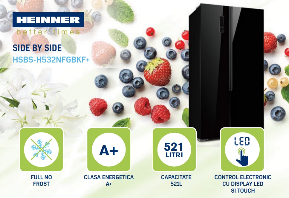 Side by Side Heinner HSBS-H532NFGBKF+, 521 L, No Frost, H 177 cm (Negru)