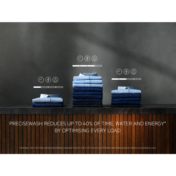 *Test intern pentru durată, consum de apă și energie al unui ciclu pentru bumbac la 30°C optimizat cu PreciseWash, pentru o încărcătură de 1 kg față de încărcătura maximă.