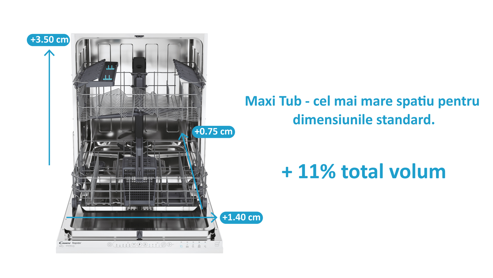 Masina de spalat vase Candy Rapido are o capacitate maxima de incarcare de pana la 16 seturi.