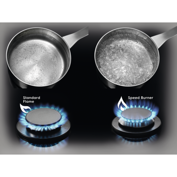 Arzătoarele rapide Speed Burner pe gaz sunt un mod rapid și eficient de a găti. Spre deosebire de plitele convenționale pe gaz, arzătoarele rapide Speed Burner utilizează cu 20% mai puțină energie. În plus, direcționează cu precizie flacăra pentru a încălzi baza cratițelor și tigăilor, pentru a putea găti mai rapid mâncarea.