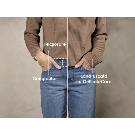 DelicateCare utilizează tehnologia cu pompă de căldură pentru a usca articolele delicate cu mișcări și temperaturi personalizate ale tamburului, ajutând astfel hainele să reziste mai mult timp. Chiar și țesăturile precum mătasea și lână sunt uscate cu o îngrijire superioară. Certificată Woolmark.