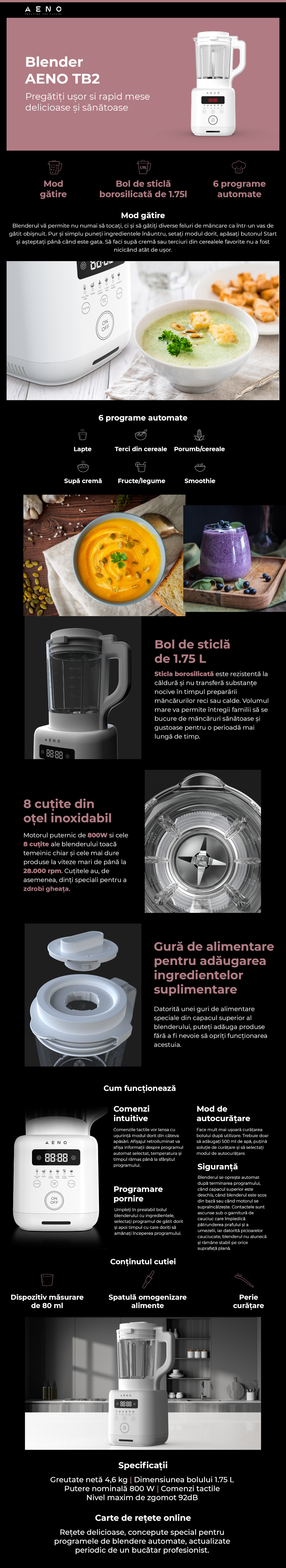 Gleb Blender AENO TB2, 800W, 35000 rpm, 1.75L, 6 programe automate (Alb)Blenderul este excelent pentru cocktailuri, shake-uri și supe, făcându-le perfect netede. Cu toate acestea, uneori trebuie să adăugi mai mult lichid pentru a obține consistența dorită.