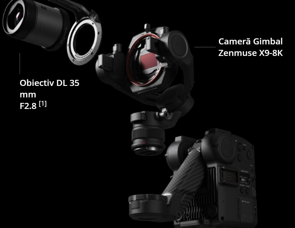 Montura DL standard a lui X9 accepta trei obiective compacte cu cadru intreg. Carcasele sunt realizate din fibra de carbon monococa usoara, astfel incat fiecare lentila cantareste doar 180 g. Mai multe lentile DJI vor fi disponibile in viitor.