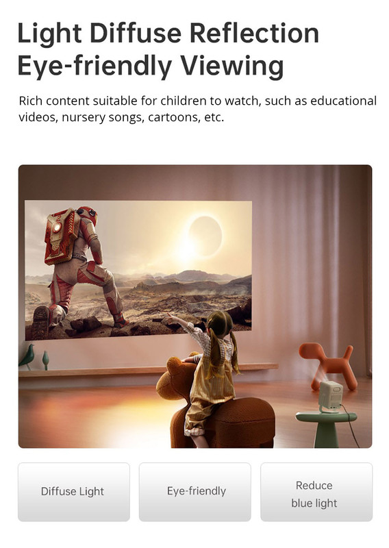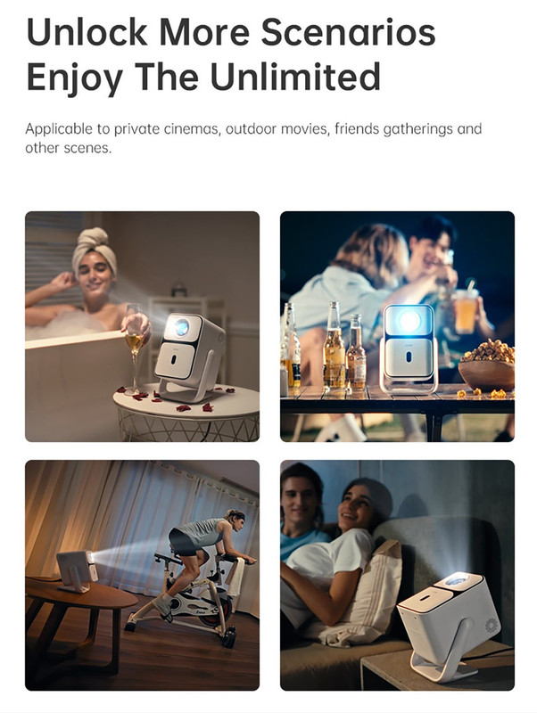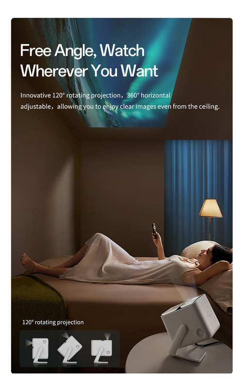 Proiectie inovatoare rotativa la 120°, reglabila orizontal la 360°, poate fi amplasata pe noptiere, masute de cafea si in alte locuri, permitandu-va sa va bucurati de imagini clare chiar si pe tavan.