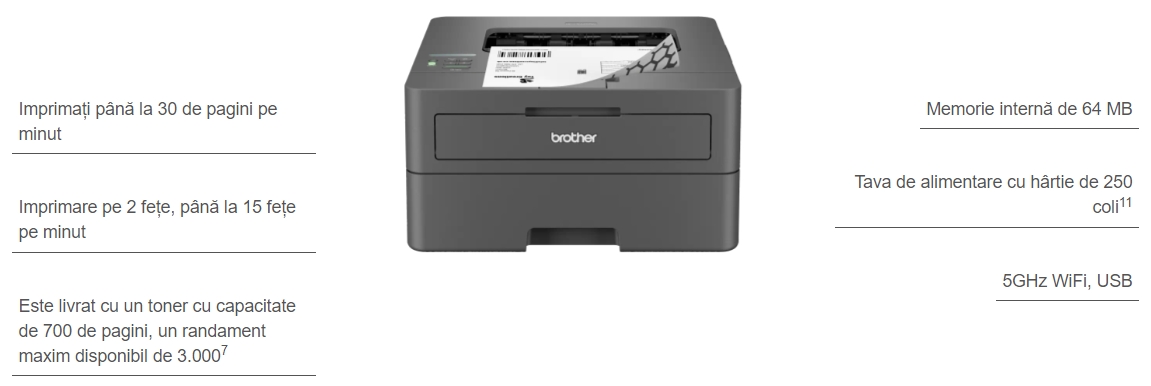 HLl-L2442DW este conceput pentru a crește eficiența, cu viteze mari de imprimare care vă ajută să lucrați mai inteligent. Tava mare de alimentare cu hârtie și funcția de imprimare pe 2 fețe vă economisesc timp, permițându-vă să vă reluați alte sarcini.