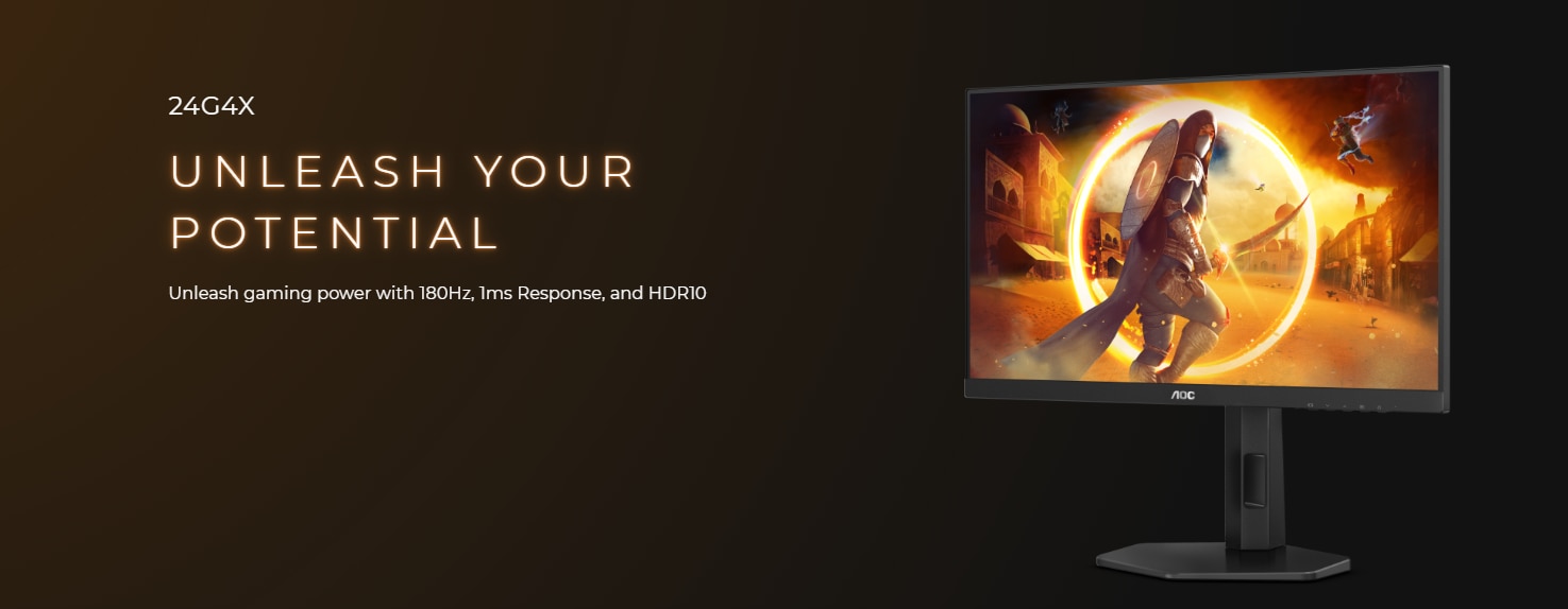 Descrierea produsului Monitor Gaming IPS LED AOC 23.8" 24G4X, Full HD (1920 x 1080), HDMI, DisplayPort, Boxe, 180 Hz, 0.5 ms (Negru)