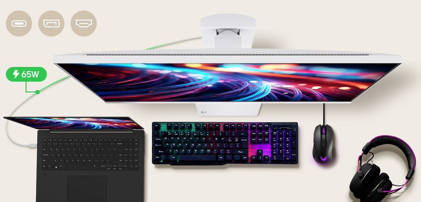 Conectati laptopul la monitor cu un cablu USB-C pentru o alimentare de pana la 65 W, eliminand necesitatea unui adaptor separat. Bucurati-va de o rezolutie 4K UHD si o rata de reimprospatare de 144 Hz prin USB-C, DP 1.4 sau HDMI 2.1.