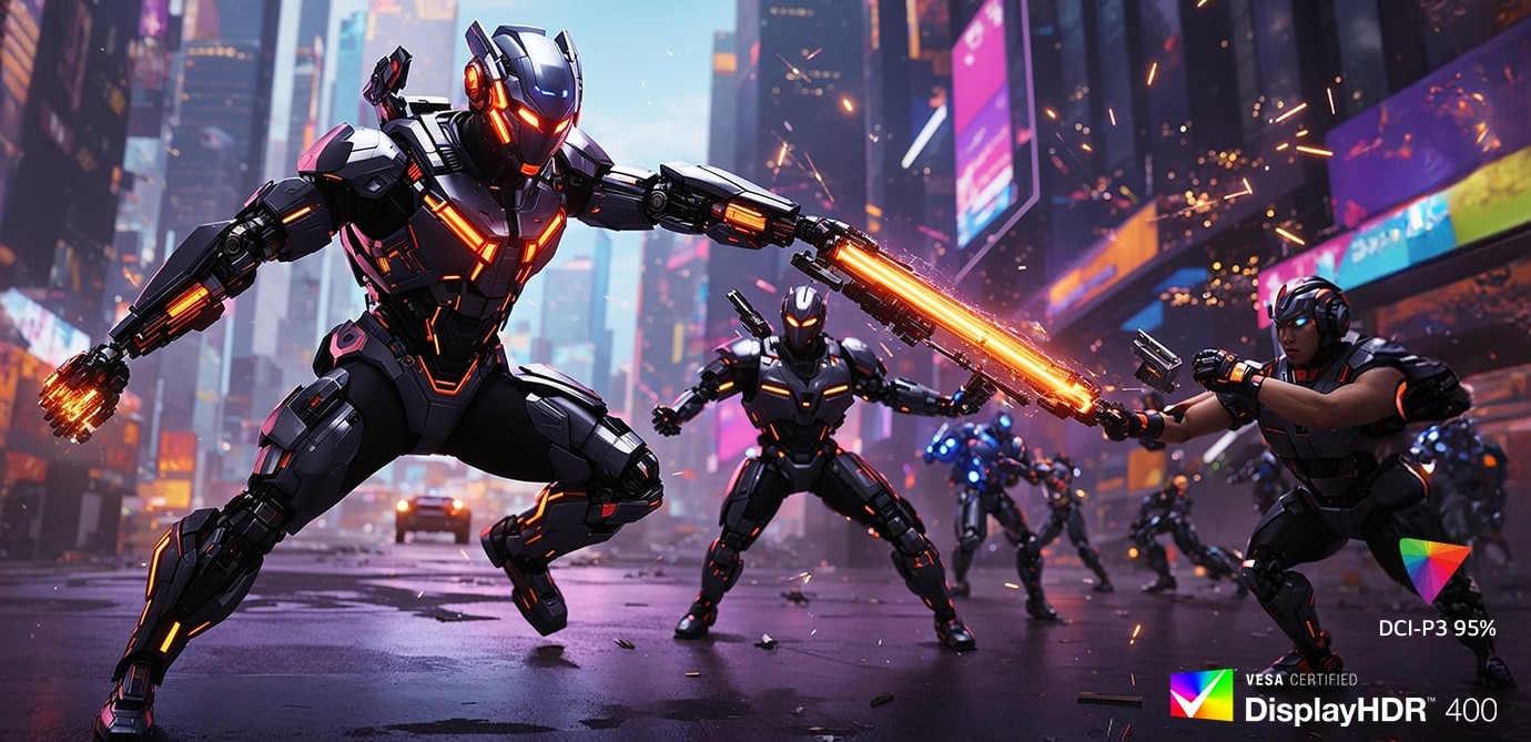 Monitorul nostru de jocuri suporta un spectru larg de culori, 95% (Tip.) din gama de culori DCI-P3, exprimand culori de inalta fidelitate pentru reproducerea cu VESA DisplayHDR 400, permitand o experienta de joc realista.