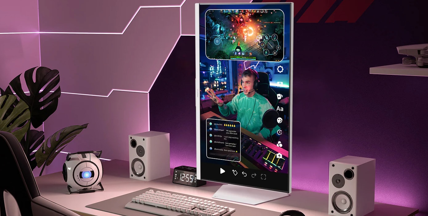 Intra intr-un sanctuar de gaming elegant si stilat cu o configuratie de monitor de gaming alb. Pivotul cu modul vertical face mai mult decat sa roteasca pur si simplu ecranul in lung, optimizand continutul vertical pentru o experienta de forma scurta, in timp ce suportul compact in L minimizeaza utilizarea spatiului de birou.