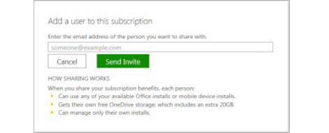 Fiecare abonament Office 365 pentru Acasă îți permite instalarea Office pe 5 dispozitive Mac sau PC-uri și 5 tablete. Deținătorul abonamentului poate partaja abonamentul cu până la 4 persoane din casă, astfel încât ei vor folosi instalările de care tu nu ai nevoie. Este la fel de simplu ca și cum ai trimite un e-mail și fiecare utilizator va primi: