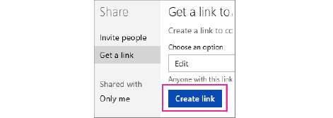 Dacă nu știi adresa de e-mail a persoanei cu care vrei să partajezi documentul, sau dacă vrei un link care să permită utilizatorilor să editeze documentul fără a fi nevoiți să se autentifice, fă click pe Get a link după ce faci click pe Share. Apoi selectează Create link și astfel obții un link pe care îl poți copia și-l poți da mai departe.
