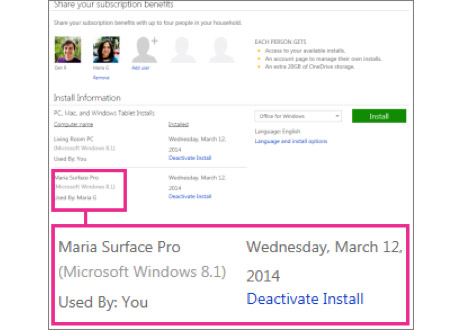 Fiecare persoană pe care o inviți va putea accesa propria sa pagină de administrare a contului pe care o va putea utiliza pentru a instala Office. După ce finalizează instalare, vei pute vedea pe pagina ta, la secțiuna Used by numele computerelor pe care este utilizat Office.
