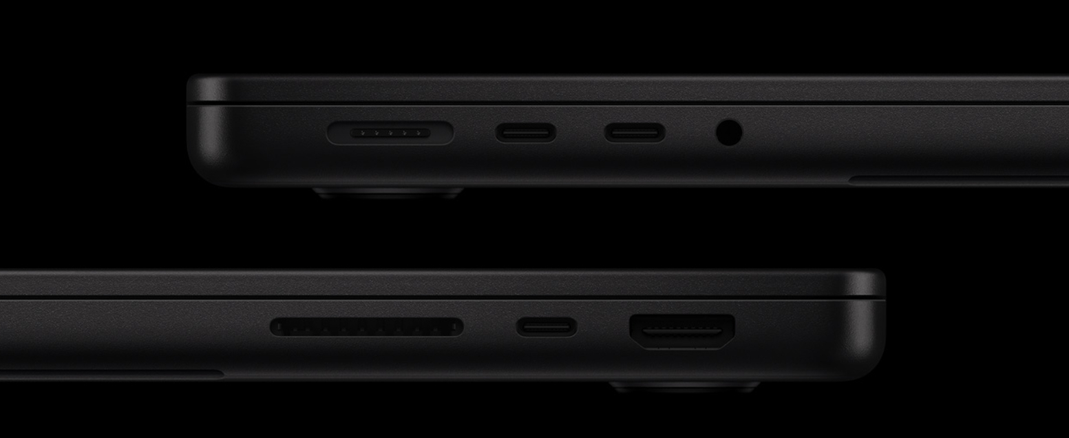 MacBook Pro include o gamă de porturi pentru conectarea perifericelor de mare viteză, gestionarea ecranelor de rezoluție înaltă sau descărcarea directă de pe cardurile SDXC. Modelele cu cipuri M4 Pro și M4 Max acum includ Thunderbolt 5 ce oferă viteze de transfer de până la 120 Gb/s (iar cele cu cipuri M4 includ Thunderbolt 4 ce ofera viteze de transfer de până la 40 Gb/s) Acceptă monitoare externe. Cu cipurile M4 și M4 Pro poți conecta până la două monitoare externe cu rezoluție mare, iar cu M4 Max, până la patru monitoare. |
