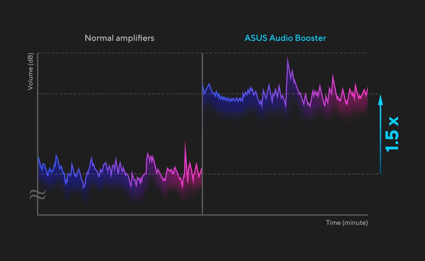 ASUS Audio Booster utilizeaza algoritmi audio unici pentru a mari volumul audio de pana la 1,5 ori si pentru a duce experienta audio la un alt nivel.