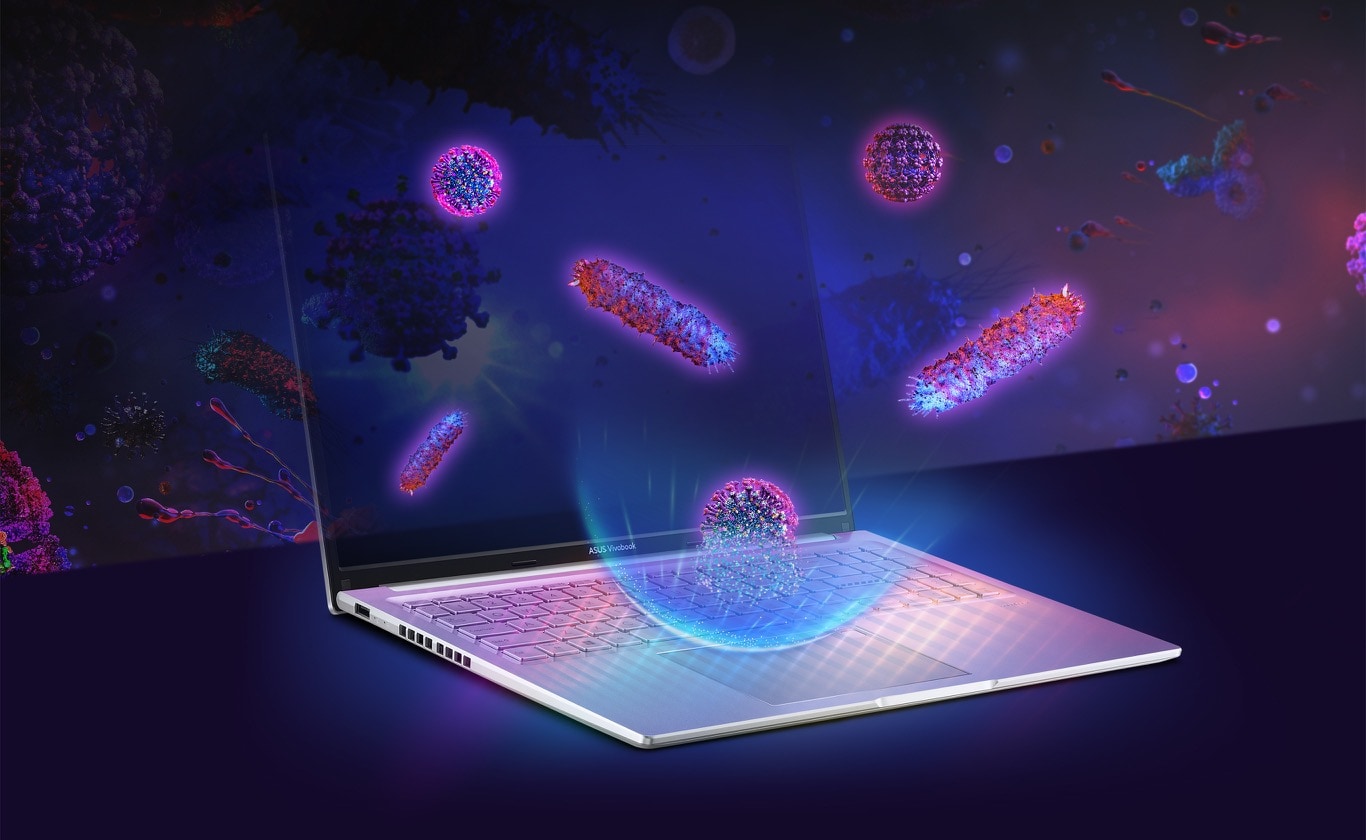 ASUS Antimicrobial Guard Plus este un strat de acoperire a suprafetei pe laptop care contine ioni de argint incarcati pozitiv. Ionii de argint si celulele microbiene incarcate negativ sunt atrase reciproc si apoi strapung suprafata pentru a le deteriora structura, inhiband reproducerea.