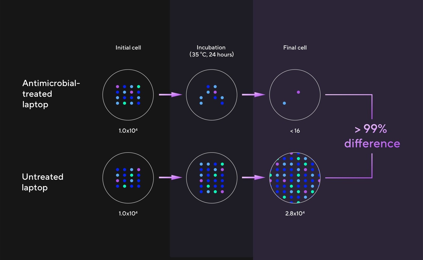 ASUS Antimicrobial Guard Plus este aplicat pe zonele frecvent atinse ale laptopului tau pentru a contribui la mentinerea igienei acestuia. Aceasta tehnologie utilizeaza un tratament mai dens* care inhiba virusii si bacteriile. Si este demonstrat stiintific - folosind standardul ISO 2170210 si 2219611 standarde - pentru a inhiba cresterea virusilor si a bacteriilor cu mai mult de 99% pe o perioada de 24 de ore12. Printre tulpinile utilizate pentru teste se numara SARS-CoV-2 (COVID-19), H3N2 (gripa A) si bacteria E. coli 4.