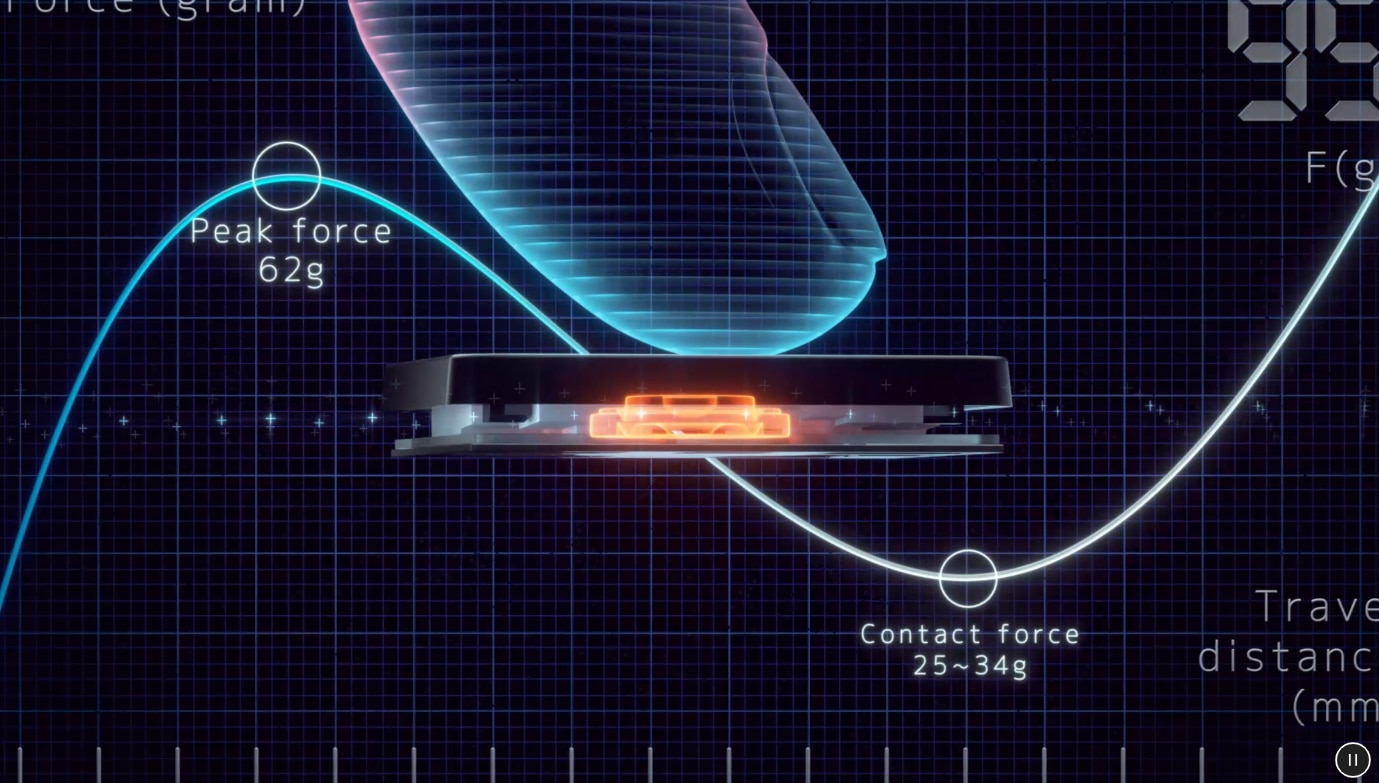 Senzatia unei tastaturi depinde de raportul crucial dintre forta de varf (cunoscuta si sub numele de forta de actionare) si forta de contact. Forta de varf apare atunci cand apasati pe o tasta si atingeti forta maxima pe care domul de cauciuc care sta la baza tastei o poate suporta fara sa se devieze. Forta de contact apare atunci cand partea de jos a tastei atinge placa de circuit pentru a declansa un semnal electronic, care la randul sau genereaza actiunea corespunzatoare tastei. Pentru a obtine o senzatie cat mai naturala pentru o tastatura, expertii in tastaturi ASUS au stabilit stiintific ca raportul optim de clic ergonomic pentru o tasta este cuprins intre 45-60%. Aceste forte sunt masurate cu precizie si reglate cu ajutorul domurilor de cauciuc proiectate de ASUS sub taste.