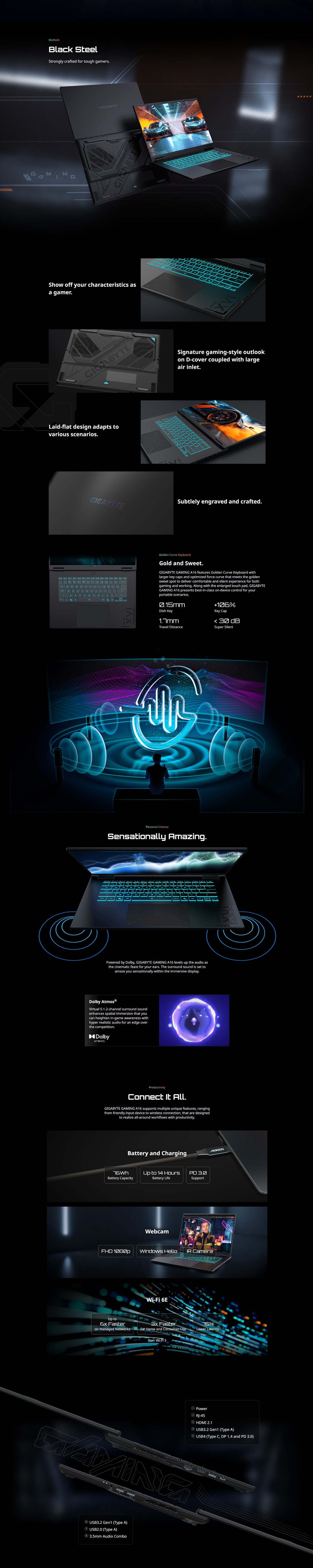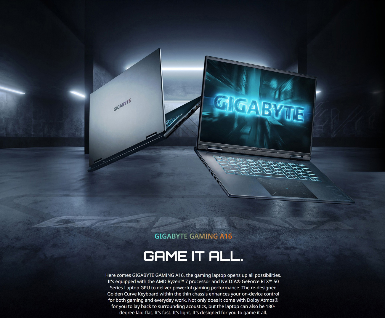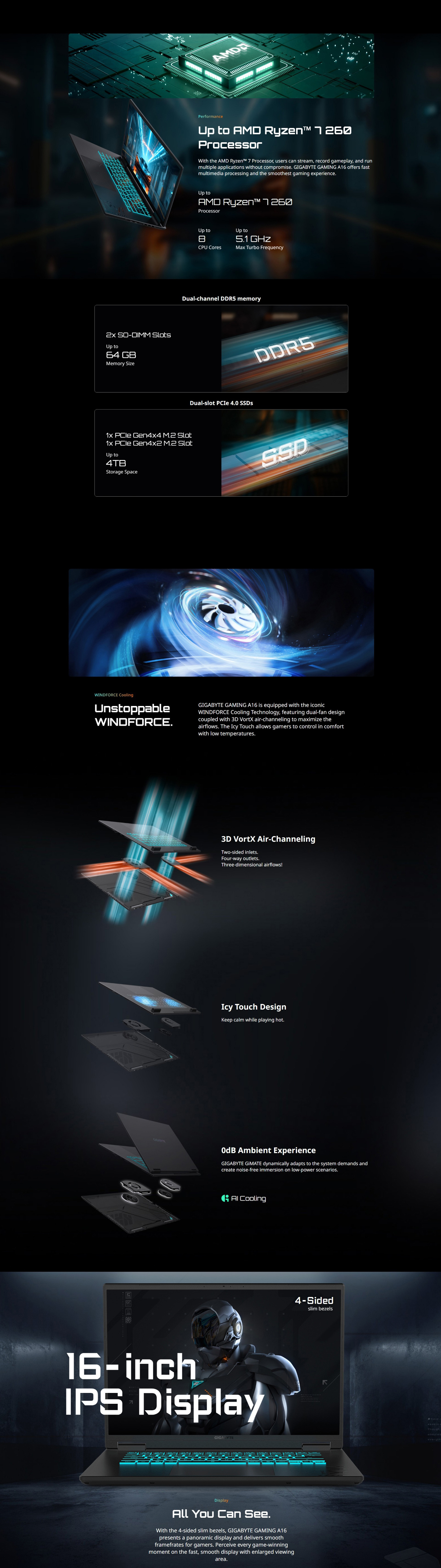 Descrierea produsului Laptop Gaming GIGABYTE A16 3TH (Procesor AMD Ryzen™ 7 260 (16M Cache, up to 5.10 GHz) 16" WUXGA 165Hz, 16GB, 1TB SSD, GeForce RTX 5050 @8GB, Negru)